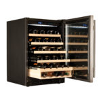 This 48-bottle wine cooler combines style and functionality with a sleek stainless steel door and a 3/4″ pro-style handle. It features soft lighting with auto/manual control to create a customizable ambiance. The unit includes four glide-out shelves with wood trim and a glide-out storage basket for easy wine access. The reversible door allows flexible installation, and electronic controls offer both Celsius and Fahrenheit options. Sabbath mode functionality ensures compliance with Sabbath-observing practices. The dual-zone temperature management system includes a movable divider, allowing independent control of the upper (50°F–65°F) and lower (43°F–65°F) zones, keeping red and white wines at their ideal temperature. Perfect for wine enthusiasts, this cooler maintains the ideal conditions for preserving and showcasing your wine collection.