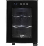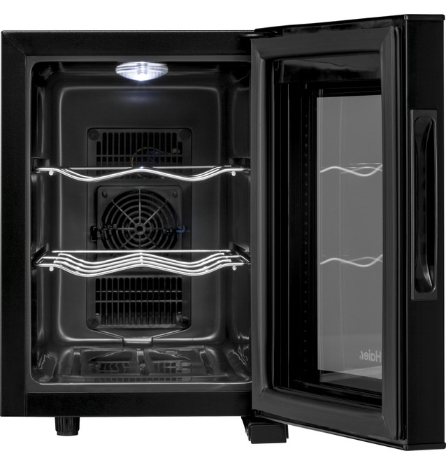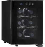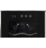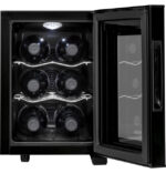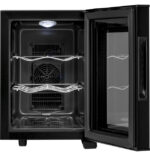 The 6-Bottle Wine Cellar offers a sleek and compact storage solution, perfect for countertops and small spaces. Ideal for wine enthusiasts, this stylish unit features a curved door with smoked glass and black trim, giving it a modern, elegant appearance. The matching black cabinet enhances its overall aesthetic, blending seamlessly into any room décor. Equipped with an adjustable digital thermostat, the wine cellar allows you to set a temperature range between 46–66°F, suitable for both red and white wines. The blue LED display makes it easy to monitor and control settings with precision. Two full-width chrome wire racks provide stable, organized storage for up to six bottles, keeping them secure and easy to access. This compact cooler combines function and style, offering optimal conditions to preserve your wine’s flavor and quality in a space-saving design.