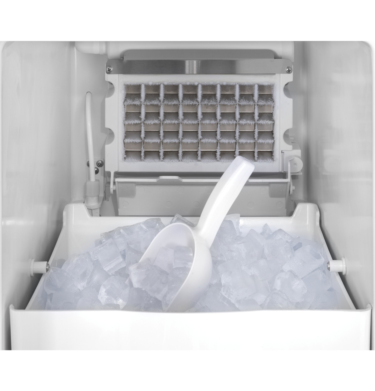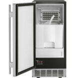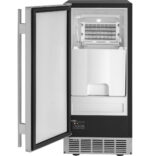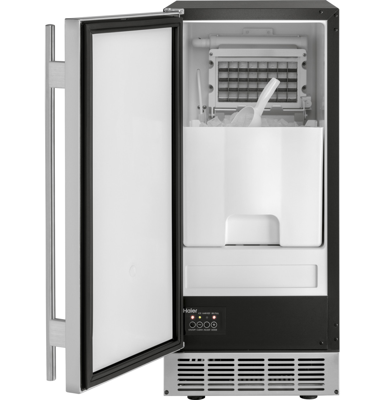 This built-in ice machine offers versatile installation options, allowing it to be placed in cabinetry or used as a freestanding unit. It features a high-capacity output, producing 50 pounds of semi-clear ice per day, and comes with a spacious storage bin that holds up to 25 pounds of ice. The unit also includes a reversible door, providing flexibility to change the swing direction for right or left use based on your space requirements. Additionally, it is equipped with an electronic cleaning cycle, making maintenance convenient and ensuring the ice machine operates efficiently.